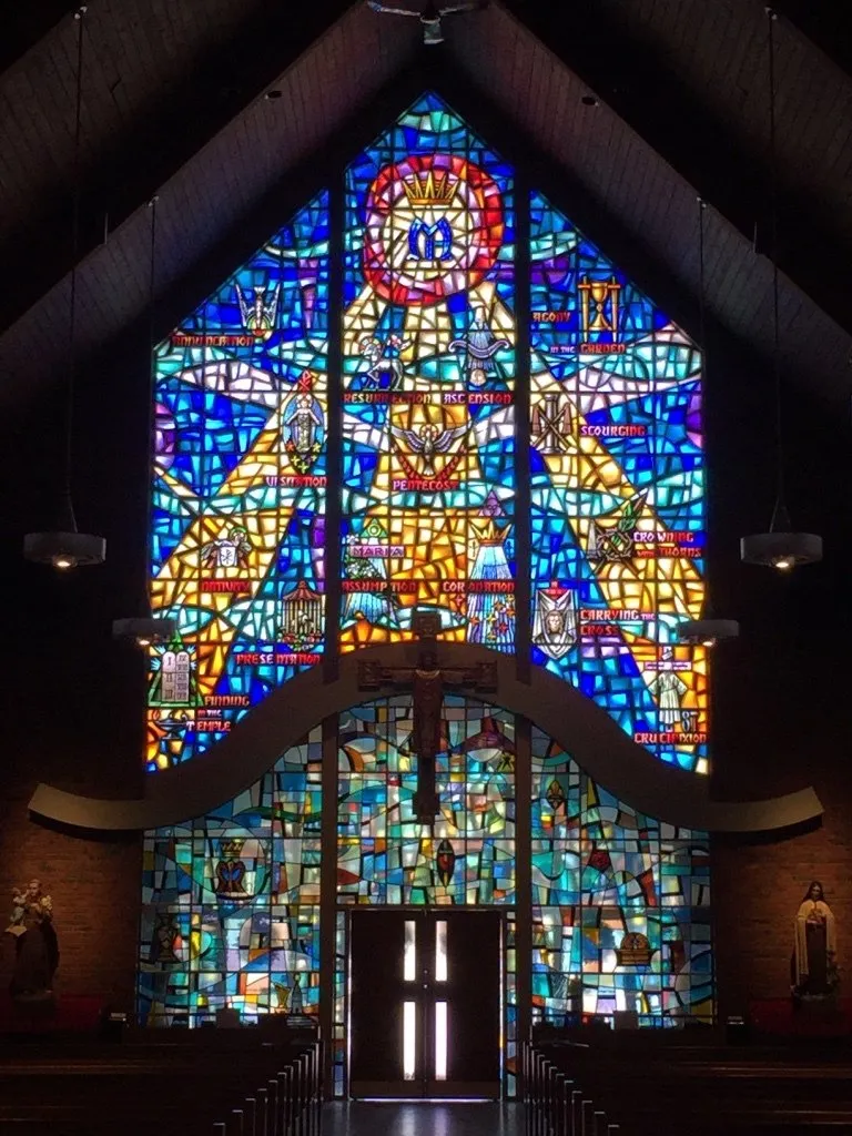 Remember a loved one through the illumination of the Stained Glass Window located above the main entrance of Our Lady's Church. The donation is $50 for the window to remain illuminated for one week in memory of your loved one.
